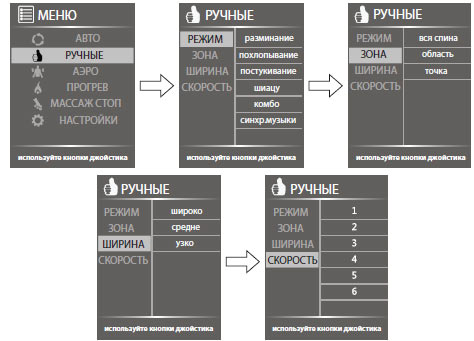 Зоны массажаШея, плечи, спина, поясница, руки, ягодицы, бёдра, икры, стопы